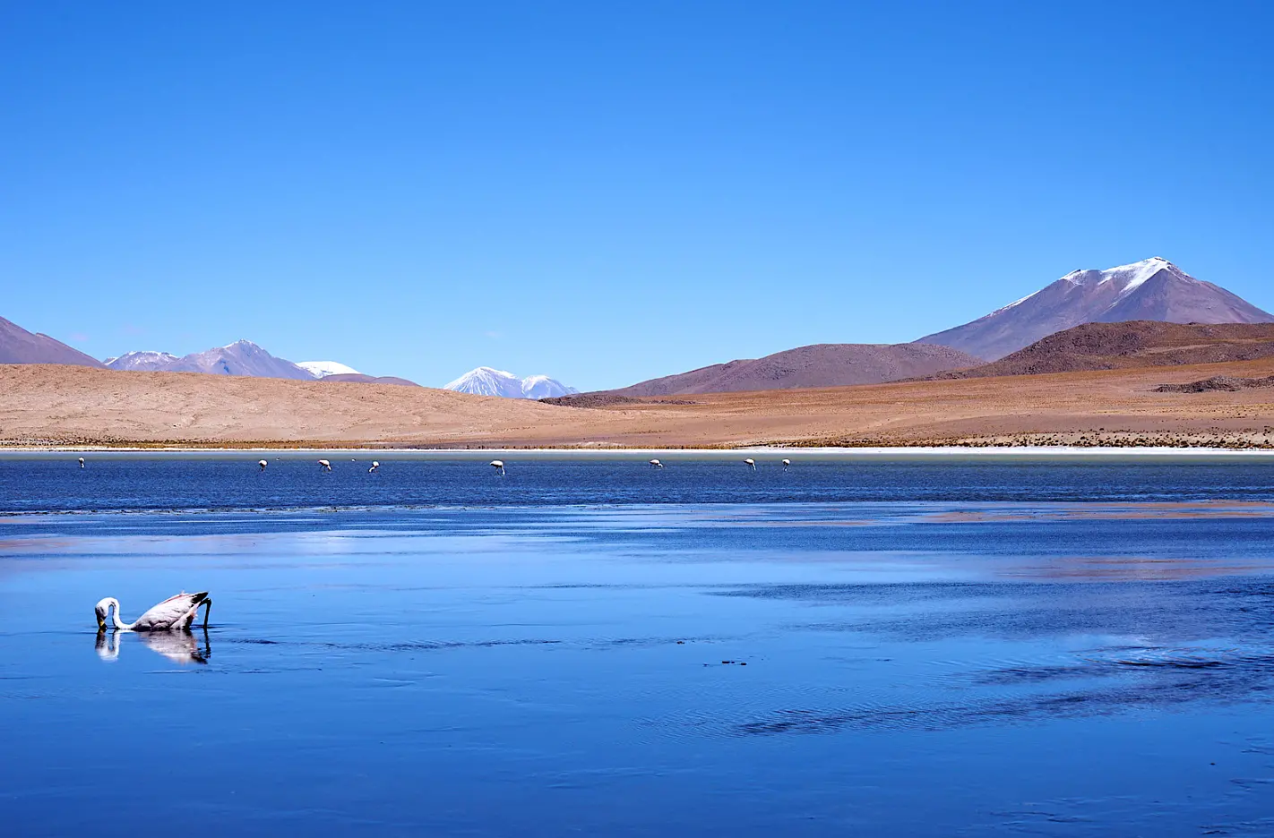 Early in the morning, we will resume our journey towards the Ollagüe Volcano viewpoint, offering a stunning view of this active Andean giant. Our route will take us to the mesmerizing Cañapa, Hedionda, and Honda Lagoons, where flocks of pink flamingos create an unforgettable natural spectacle.